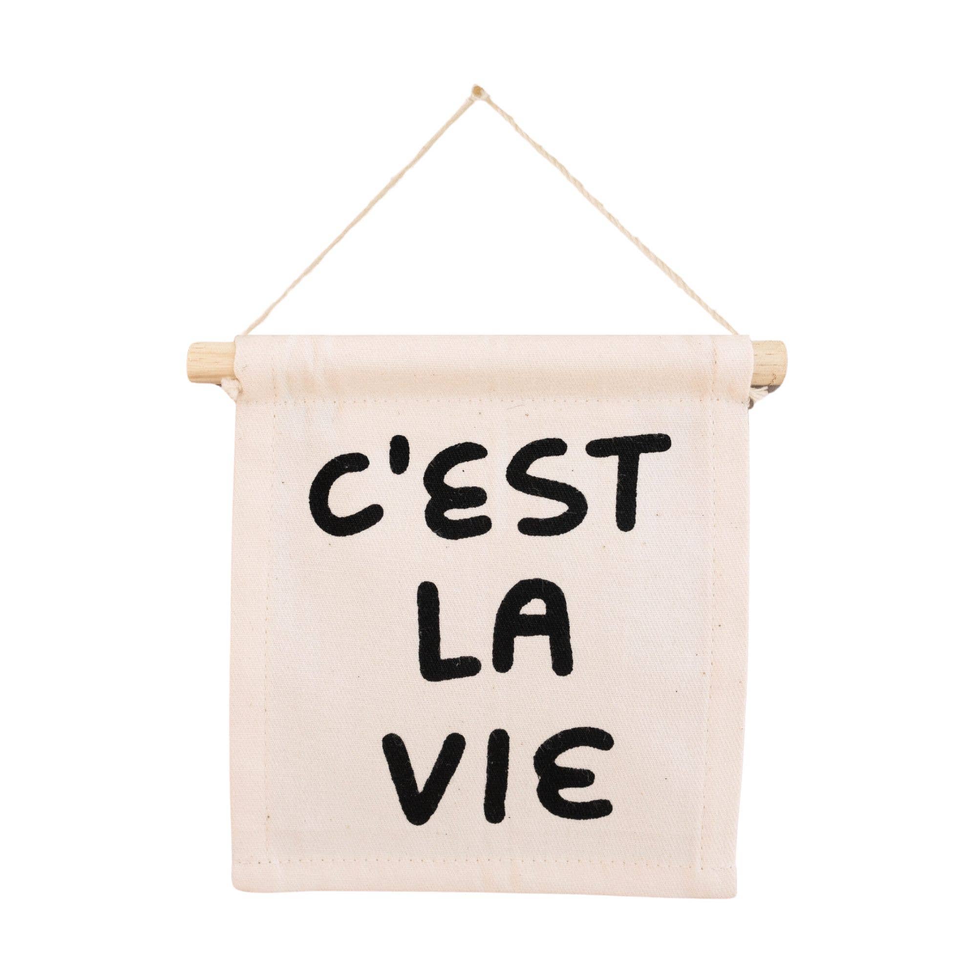 d e s c r i p t i o n "C'est La Vie" hang sign on natural canvas with a poplar wooden dowel. Sewn and screen printed by hand on natural canvas by empowered artisans in Mombasa, Kenya s p e c s + natural canvas + poplar dowel rod and cotton thread sourced from Kenya + canvas: 6in x 7in + dowel: 7in w a s h & c a r e Spot clean only. Do not put in washing machine or dryer. If your hang sign is creased or wrinkled, place your hang sign print side down on ironing board and iron on a low/medium heat. Do not iron on front side directly on screen print. Do not use high heat. Do not keep iron in one place for too long. You can also steam the hang sign, but steam from the back side of the hang sign. Do not place in dryer to get rid of wrinkles/creases.