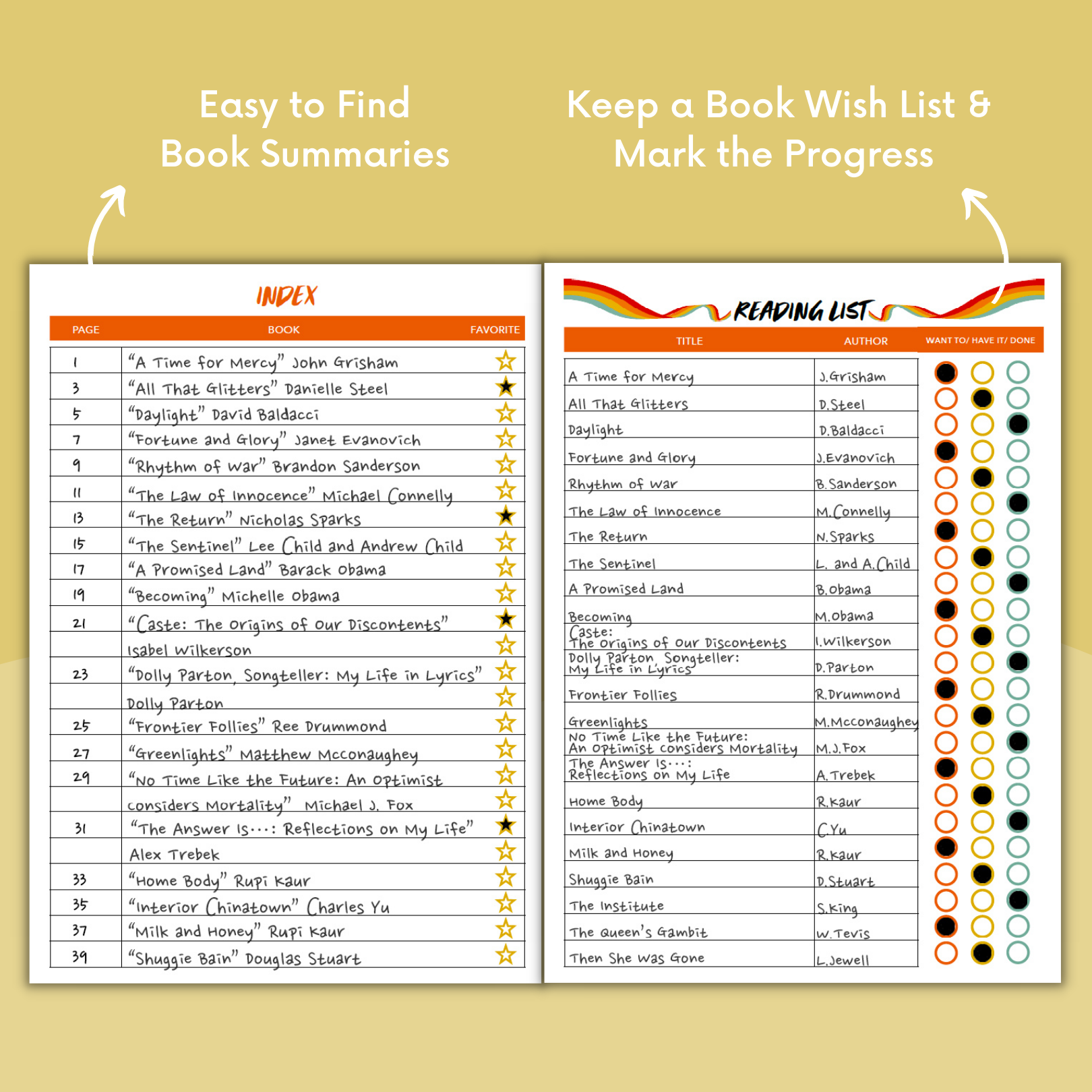 Capture your reading journey with this versatile reading journal, perfect for book lovers. • Keep track of favorite books and key details with a simple, fun book review journal • Stay motivated to read daily by using this reading log journal to track your progress • Fun gift for anyone – the perfect book journal for book lovers out there! Pages inside: • 80 book summaries • Reading list • Daily reading tracker • Index pages • Quotes & illustrations Features: • A5 size (8.3 x 5.8") • Faux leather hardcover • 100gsm FSC Certified Paper • Sewn Binding Organize and enhance your book collectiom with this reading planner!