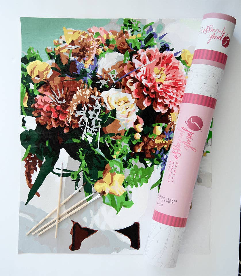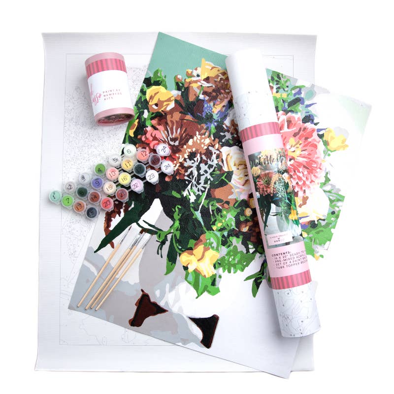 In collaboration with Main Street Florist, this original image is turned into a paint by numbers kit.  Each kit includes a great quality template printed canvas, a 4 brush set, handy little pots of acrylic paint, and a map just in case you need to find a number you missed.  Each of our projects is about 12 hours.  Paint however you would like.  Enjoy!   PRODUCT INFO Contents: • 16 x 20” ready-to-paint premium printed canvas • Pre-mixed acrylic paints in handy little pots • Set of 4 paint brushes Each kit is made for success.  The areas are clearly marked and numbered so that you just match the paint with the number.  Start at 1 or your favorite color...no rules.  Layer the paint for a little bit of depth.  Beautiful success in a tube.... have fun and likely you will want more than one.