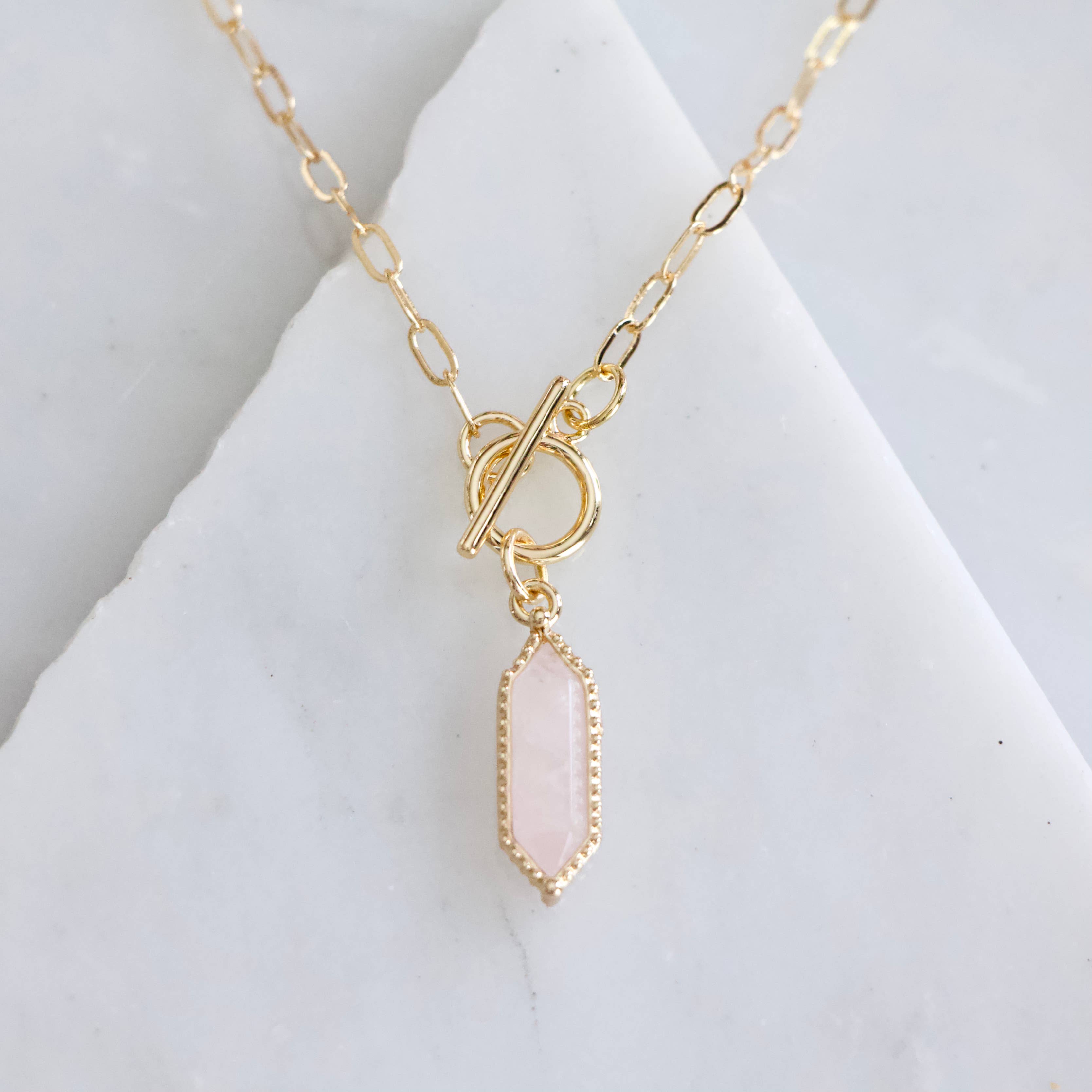 Faceted Quartz, Lapis Lazuli, Rose Quartz, Koren Jade Toggle Necklace Details: • MATERIAL: 18K gold plated over brass • PENDANT SIZE: 22x8mm • CHAIN LENGTH: 18" • CLASP STYLE: Toggle Each stone is one of a kind and totally unique.