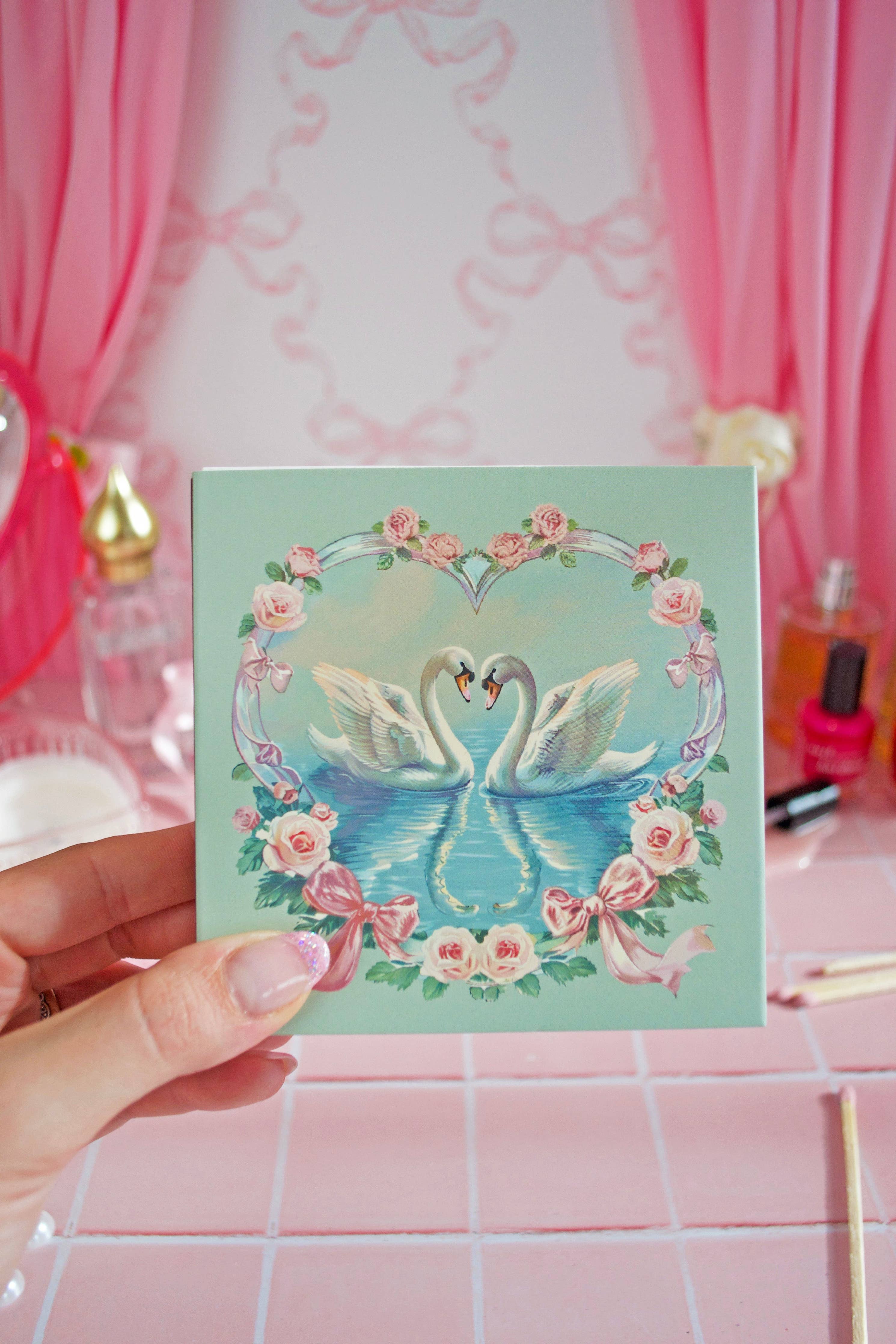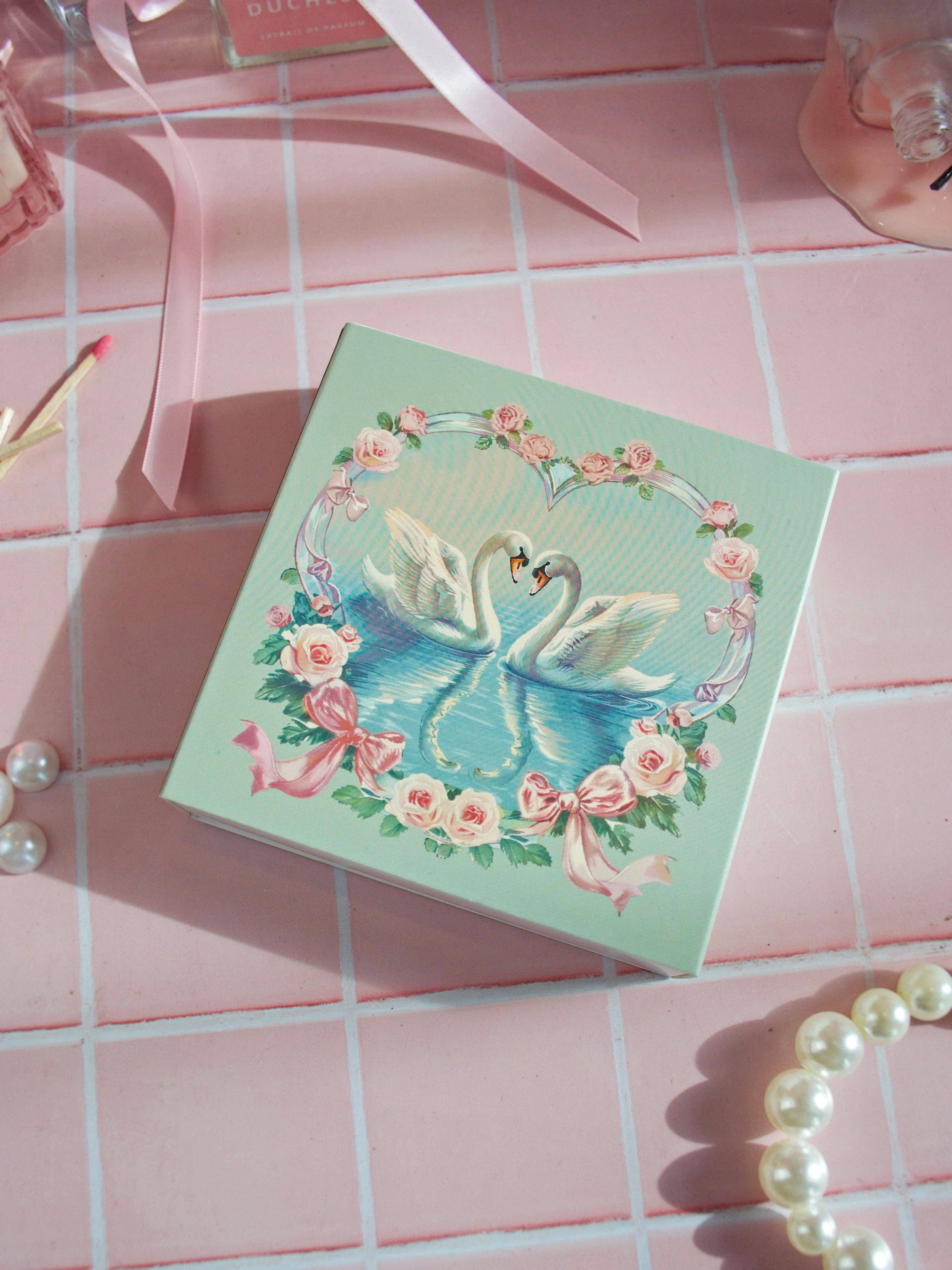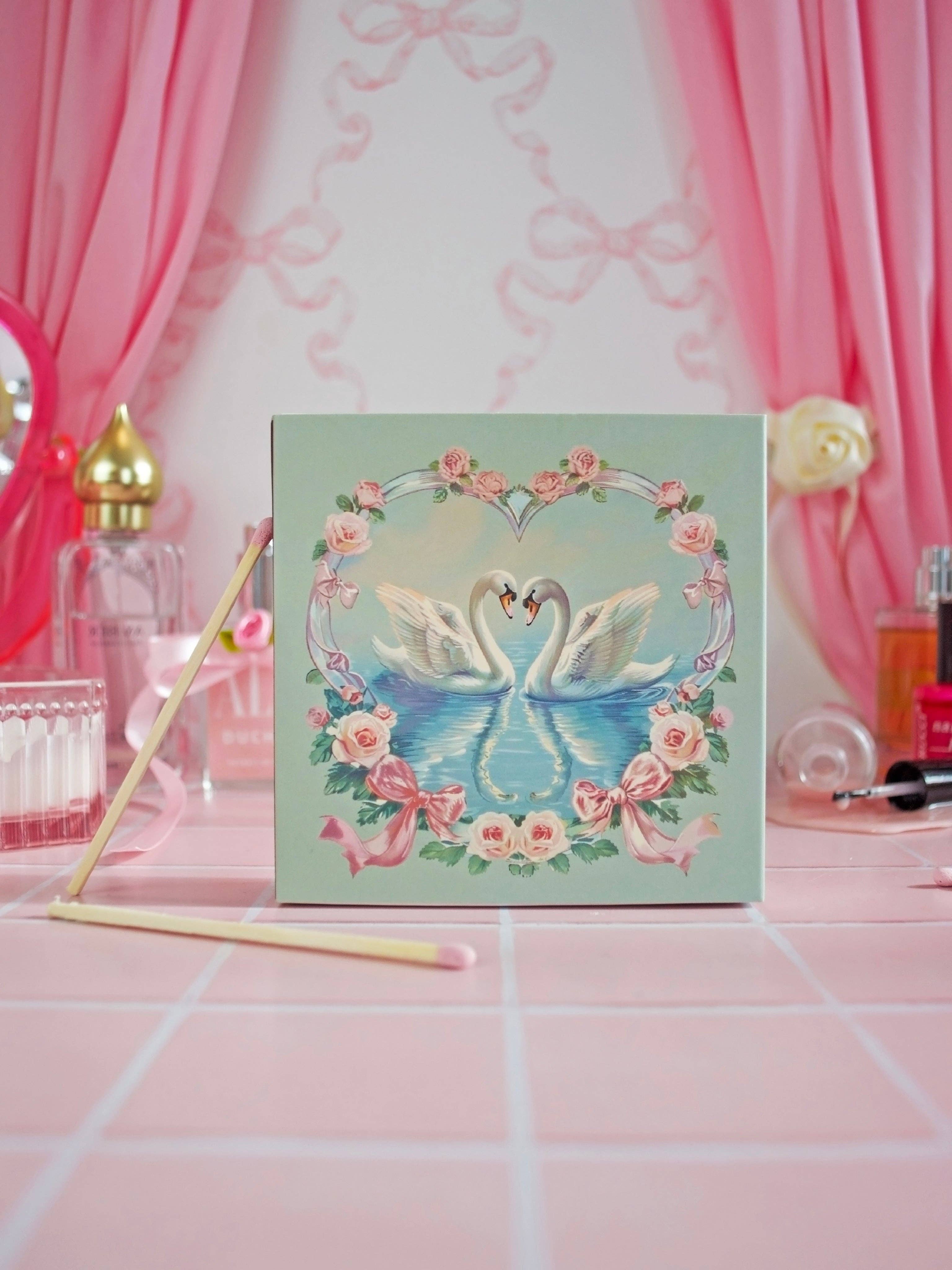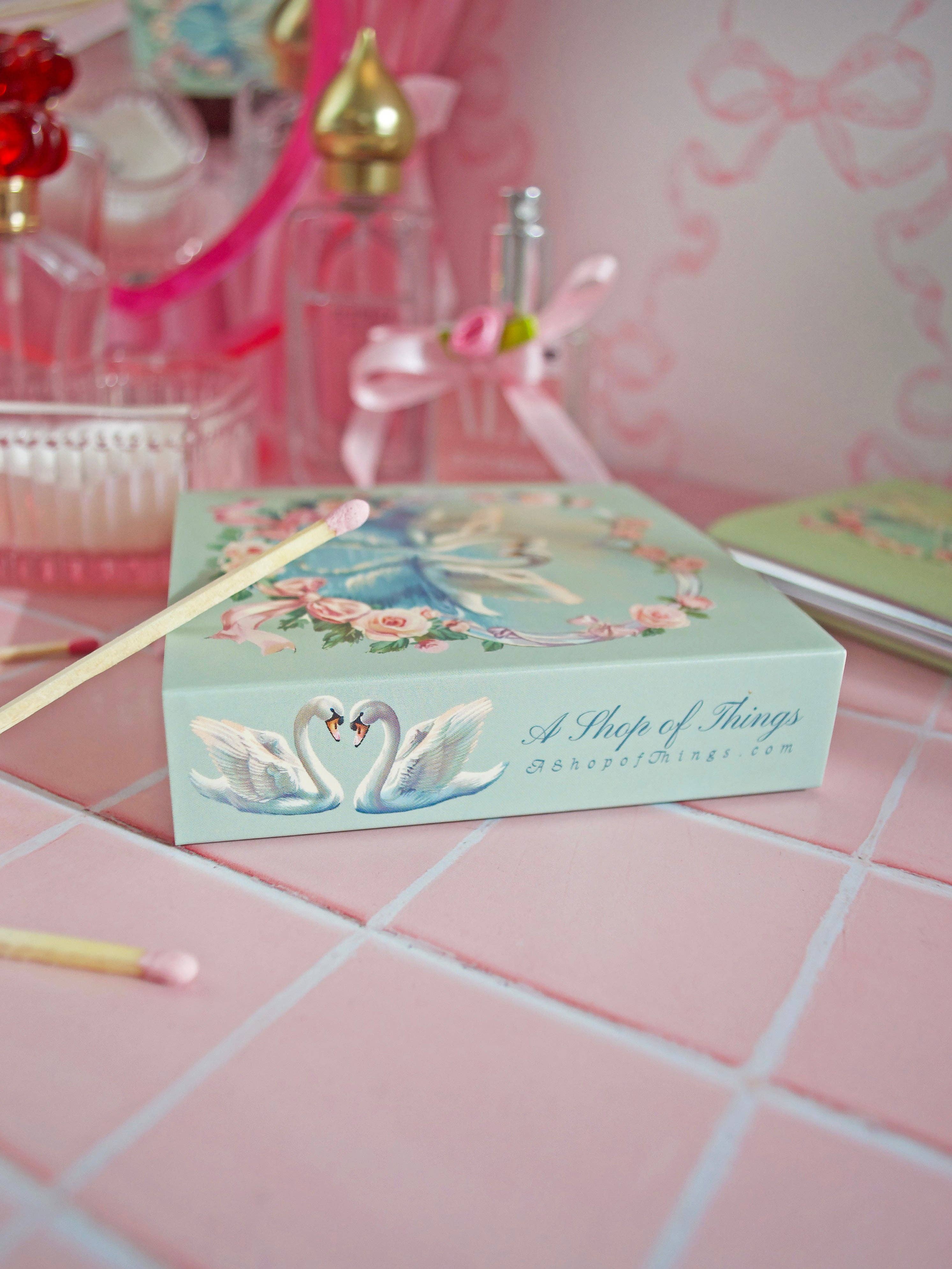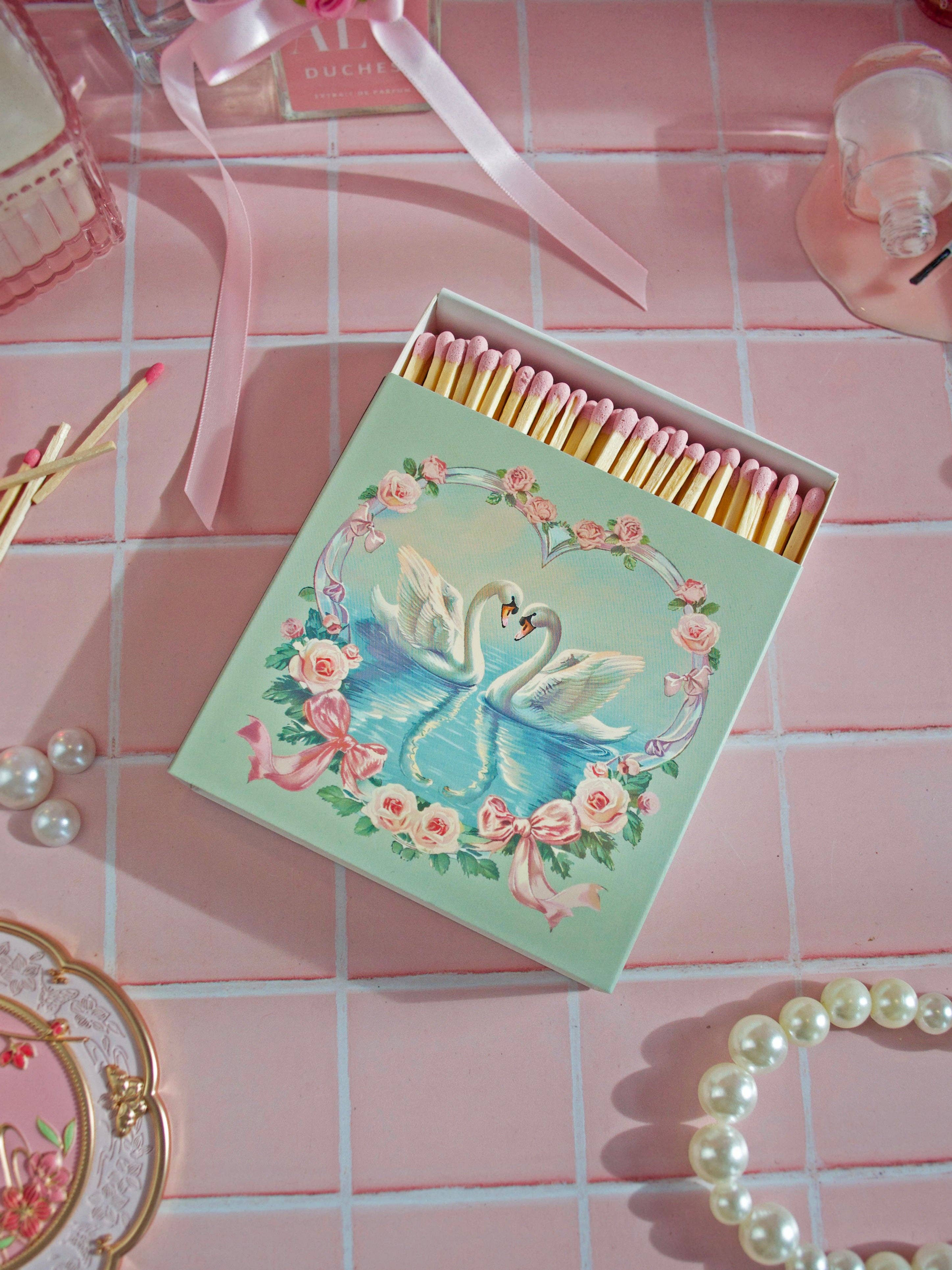 These matches are swan-derful! These darling matches are giving swan princess and we are so here for it!! The match box features the same art on the front and back, the sweetest image of two swans framed by a heart that is decorated with pink roses and bows! Pulled straight out of our coquette dreams! On the side of the matchbox is a striker and inside are large, extra special pink match sticks. Comes with approximately 130 matches! These matchboxes measure approx. 4.5" x 4.5" x 1"