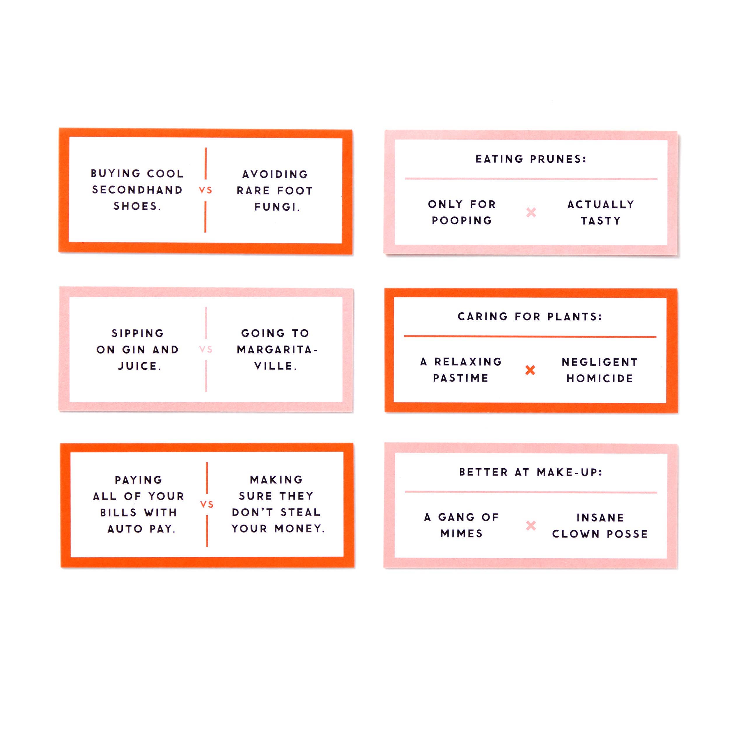 Win points for winning arguments. This social game by Brass Monkey includes 200 game cards, each featuring opposing views of hot button issues...like how to load the dishwasher like an actual human being. Just pick a side, and debate it out. There's no politics, religion, or any of that crap here. There are way more important things to fight about. For example: Those brownie edge pieces are garbage. Go ahead, prove us wrong. - Includes 200 things to argue about...not like you needed the help, dad. - Are hot dogs sandwiches? Is cereal a soup? Pick a side, then pick a fight. - Game instructions are provided - Each two-sided card measures 1.5" tall by 3.5" wide. - Box measures 4.1" square (by 2" deep if you're curious).